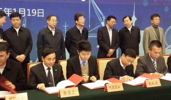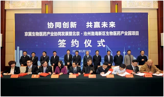 1月19日上午,“协同创新、共赢未来――京冀生物医药产业协同发展暨北京·沧州渤海新区生物医药园项目签约仪式”在石家庄举行。国家工信部总工程师朱宏任、北京市副市长张工、北京市经信委主任张伯旭、河北省副省长张杰辉、沧州市委书记商黎光、沧州市市长王大虎、沧州市委副书记、渤海新区党工委书记、管委会主任丁绣峰等领导出席仪式。新华社、中央电视台、北京日报、北京电视台等多家新闻媒体对仪式进行了报道。
